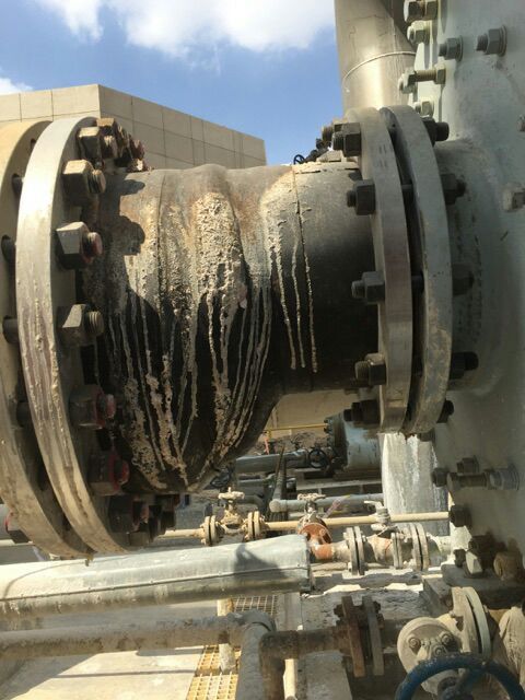 偏心和同心橡膠接頭皆為三元乙丙橡膠生產,耐壓20公斤,316L不銹鋼法蘭,用戶使用的環境為化工行業,水樣催化劑的介質,常理來說,這類介質,對橡膠球體本身并不會造成什么影響,為什么橡膠接頭會開裂呢?通過圖片情況我們可以看到,橡膠球體外部膠層開裂內部并無泄露現象,這種情況一般是由于壓力過大導致的,但用戶水泵打開壓力又并未超出橡膠接頭承受壓力范圍,所以這一情況進行排除,第二種原因就是由于生產問題,內外膠層貼合不嚴密的情況下,由于溫度影響造成內外膠層分離,進而橡膠接頭承壓能力減弱,在運行過程中容易造成開裂。